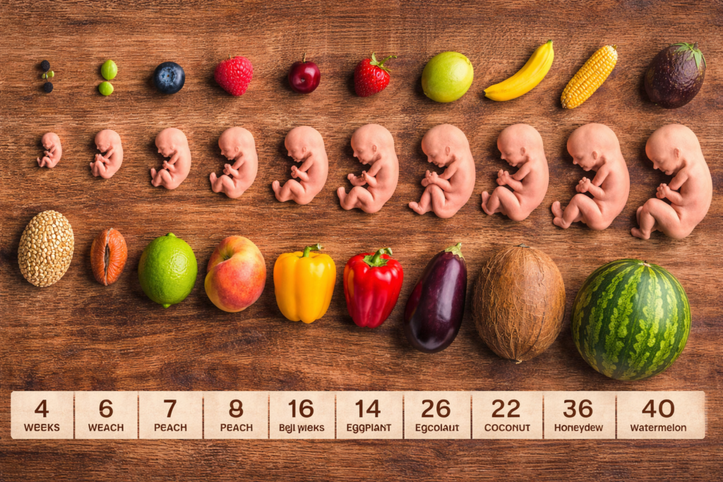 | Semanas 5 a 8 | Framboesa | O coração do bebê começa a bater. |
